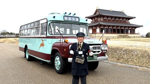 ![]() ▲奈良交通ボンネットバス平城宮周遊ツアーで大極門へ |