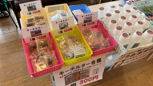 | 今年は雨対策でテントの中の展示物を縮小して臨みました、名松線ミニ写真集(第8集)の配布をはじめ、名松線ガチャ、名松線90周年を記念した新作のプラお茶容器や伊勢奥津駅の駅名キーホルダーなどで名松線の魅力をPRしました。中には東京からグッズを買うためにだけ来たという嬉しいお客様もいらっしゃいました。御来場いただいた皆様、ありがとうございました。 | ||